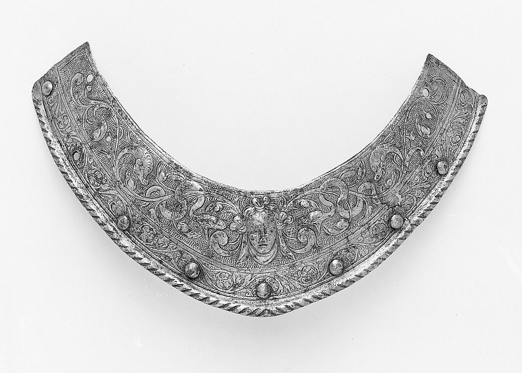 This collar plate belongs to a helmet (now in the Musée de l'Armée, Paris) that was made for the future Henry III of France (reigned 1574–89). The grotesque decoration in low relief is similar to that on the armor of Henry II of France also in the Metropolitan Museum's collection (acc. no. 39.121a–n).