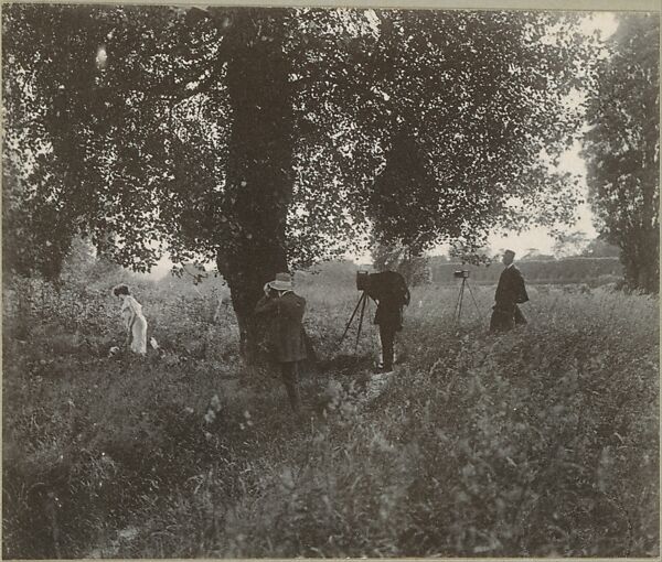 Mostly decorative, with a nod to a modish symbolism, Puyo's work is permeated with a Gallic joie de vivre and a fondness for beautiful women. Women appear in various guises: figure studies, nudes, portraits of professional models or elegant demimondaines; they are also seen simply, and more successfully, in pastoral landscapes as graceful silhouettes in vaporous, flowing dresses. Women gathering fruit or flowers was a favorite subject of the Pictorialists, who saw in the motif an agreeable enrichment of a feminine ideal. In a rare view of the photographer at work, this image of Puyo, Demachy, and their friend Paul de Singly reveals, not without irony, the photographers as hunters converging on their prey.