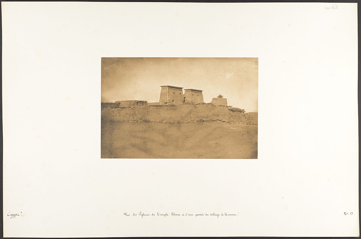 Maxime Du Camp's mission to Egypt and the Near East in 1849-51 to make a photographic survey of monuments and sites is well documented in his writings and in those of his fellow traveler, Gustave Flaubert. After an initial stay in Cairo, the two friends hired a boat to take them up the Nile as far as the second cataract, after which they descended the river at leisure, exploring the archaeological sites along its banks. In July 1850 they left Egypt for Palestine, Turkey, and Greece before they parted in Italy the following April. Du Camp's album "Egypte, Nubie, Palestine et Syrie," published in 1852 and containing 125 photographs printed by Blanquart-Evrard, brought its author instant fame. In addition to the published edition, Du Camp arranged for a private printing of a few portfolios, such as the one in the Gilman collection, which numbers 174 images particularly noteworthy for their warm color and luminescence. Possibly printed in Gustave Le Gray's studio, the present portfolio is
