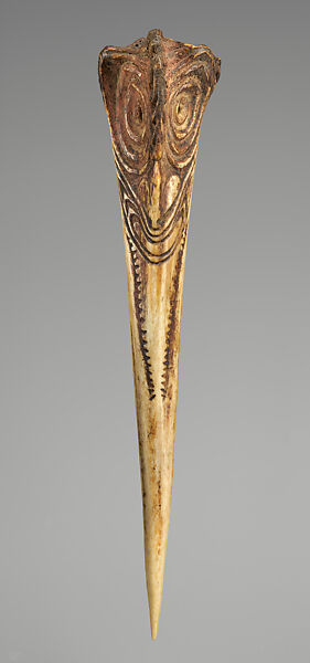 Warriors in the Sepik region formerly employed a variety of weapons. Most, such as spears, were intended to strike the enemy from a distance, but men also carried daggers for use in close combat. With blunt edges and sharp tips, daggers were exclusively stabbing weapons, often used to kill an enemy incapacitated by spears or arrows or, at times, in more stealthy acts of assassination. Many daggers were supernaturally powerful objects that played important roles in male initiation and other ceremonies. Daggers and daggerlike objects were worn as personal ornaments, and many ornate examples with blunt tips may have been ceremonial objects. Daggers were fashioned primarily from the leg bones of cassowaries (large ostrich-like birds) but also, in rare instances, from the femurs of ancestors or enemies.