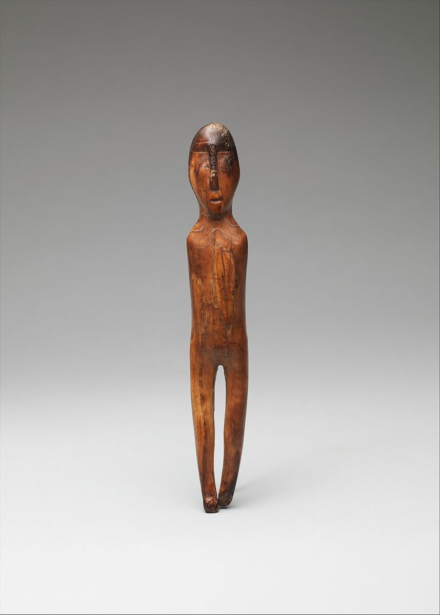 In the last two millennia before the Common Era, the peoples who established themselves along the rim of the North Pacific Ocean between Asia and America were dependent for their livelihood to a great extent on the resources of the sea. Walrus, seal, and whale were significant to subsistence, and all were hunted. On the American side, the Bering Sea Eskimo were careful to decorate the ivory and wood tools with which they hunted. The beautifully balanced and elegantly incised objects were functional tools that were incised with spirit images and designs that honored the animals the hunters sought. Harpoon heads and foreshafts, and the socket pieces known as winged objects are salient examples. Also carved of walrus ivory were human figures, most frequently female. The purpose to which the enigmatic but equally elegant figures were put is unclear. Some authorities call them dolls-originally, they may have been dressed-while others call them ceremonial objects.