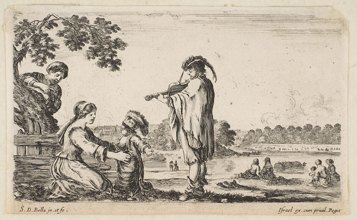 - Title: A man playing the violin in center, turned towards the left in profile, a seated woman to left playing with her dancing child, another woman standing and pointing behind a tree to left, seated women in a landscape to right in the background, from "Various figures and lands" (Diverse figure e paesi)