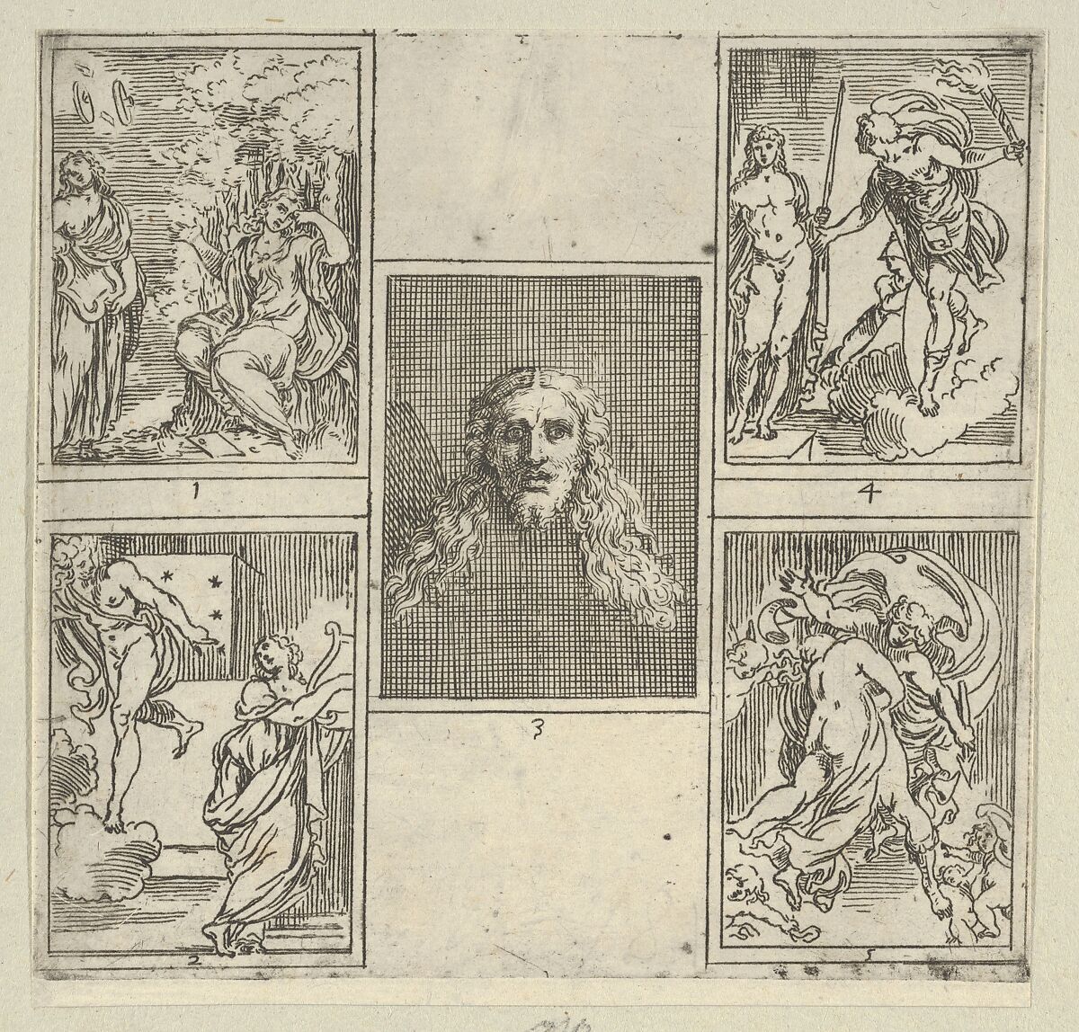 - Title: Five numbered scenes, each after a painter in the Accademia Degl'Incamminati, from IL FUNERALE D'AGOSTINO CARRACCIO FATTO IN BOLOGNA SUA PATRIA DAGL'INCAMINATI Academici del Disegno: 1. Painting and Poetry mourning the death of Agostino Carracci, painted by Francesco Brizio; 2. Painting with a lyre and Apollo pointing to stars on Carracci's grave, design by Giacomo Cavedone; 3. The head of Christ, painted by Agostino Carracci; 4. Prometheus with a torch and Athena behind him, painted by Alessandro Albini; 5. Aurora abducting Cephalus, painted by Leonello Spada.