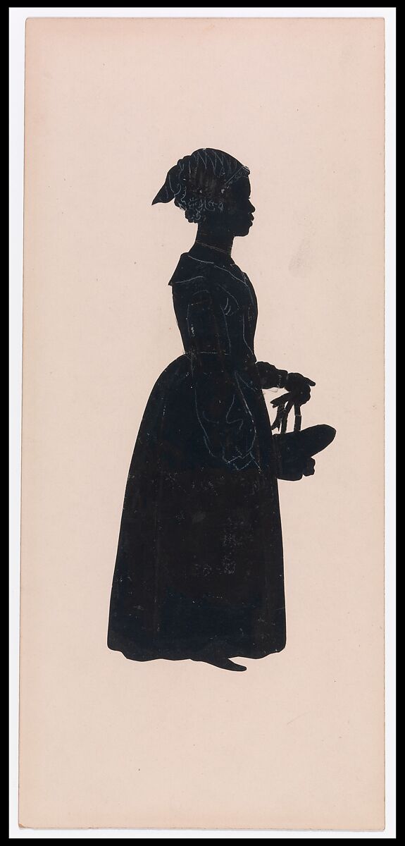 On February 6, 1844, while in New Orleans, Frenchman Auguste Edouart cut this full-length profile of an enslaved woman, only known as Dalmany—a derivative of her owner’s name, Mr. Dalman. Peter Dalman was a captain of a steamboat ship named Da Soto, known to travel the Mississippi River, carrying, among other things, cotton picked from nearby plantations. Dalmany, as she is called here, wears a long, collared dress, and carries what appears to be a basket or hat, with ribbon ties in her left hand, and a kerchief over her short curls, all of which Edouart has taken care to outline and detail in white. On the back of the silhouette, written in beautiful handwriting, most likely by the artist, are the words, "Dalmany 18 years of age / Slave / born in Kentucky, belonging to Mr. Dalman / New Orealns 6th Febry. 1884." As scholars have noted, the erasure of enslaved people’s birth names and replacement with their new owners’ names was commonplace.