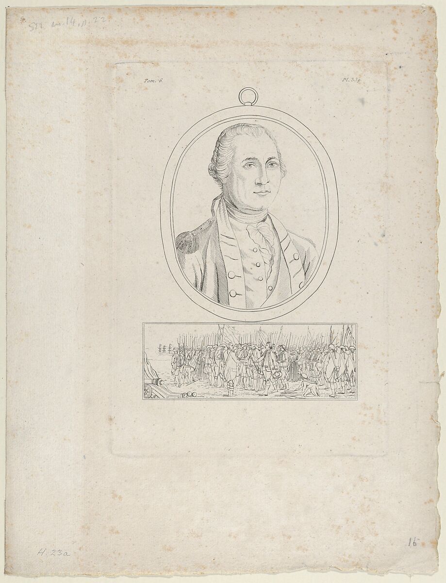 This print was made to illustrate Lavater's "Physionomie", Paris, 1820, vol. 6. The bust-lenth image of the general derives from a painting by Charles Willson Peale, its oval frame supportd by a panel that shows the British General Lord Cornwallis surrendering to George Washington at Yorktown on October 21, 1781. The latter reproduces a 1782 print by the French artist Le Barbier titled "Reddition de l'armée du Lord Cornwallis" (Lord Cornwallis' Army) and is part of a series, "Recueil d'estampes représentant les différents évènements de la guerre qui a procuré l'independance aux Etats-Unis de l'Amérique" (Collection of prints representing events that secured the independence of the United States of America), published in Paris by Nicolas Ponce. France's crucial military support to America during the Revolutionary War is underscored here. See 83.2.70 for an earlier, more fully developed, version of this print.