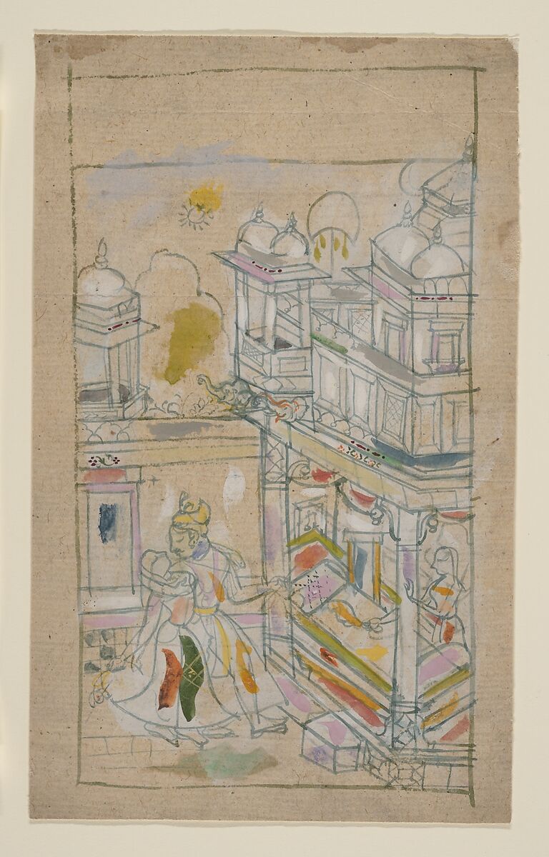 Two lovers approach a bedchamber set within an elaborate architectural façade composed of globular domes and open pavilions typical of southern Rajasthan and the kingdom of Bundi in particular. This preparatory ink painting was marked by the studio master with color swatches to instruct the artists responsible for completing the finished version.