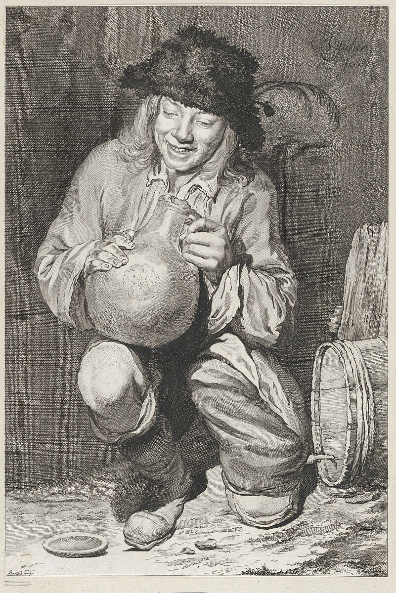 - Title: The Joy of the Cellar: kneeling farmer boy holding a jug next to wine barrel