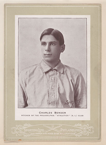 Charles Bender from Sporting Life Cabinets (W600). Issued from 1902 to 1911 by Sporting Life Newspaper Company, Philadelphia. Set consists of over 680 unnumbered cards. Player portraits are by photographer Carl Horner. Black and white or color tinted player photo. Player's name, position and team printed below studio portrait. Player shown either in uniform or in street clothes. Mounted on a thick cardboard frame. Issued in individual glassine envelopes. Ornately embossed mounts found in one of four design variations. Blank back. Sponsor ad stamped on back of some cards.