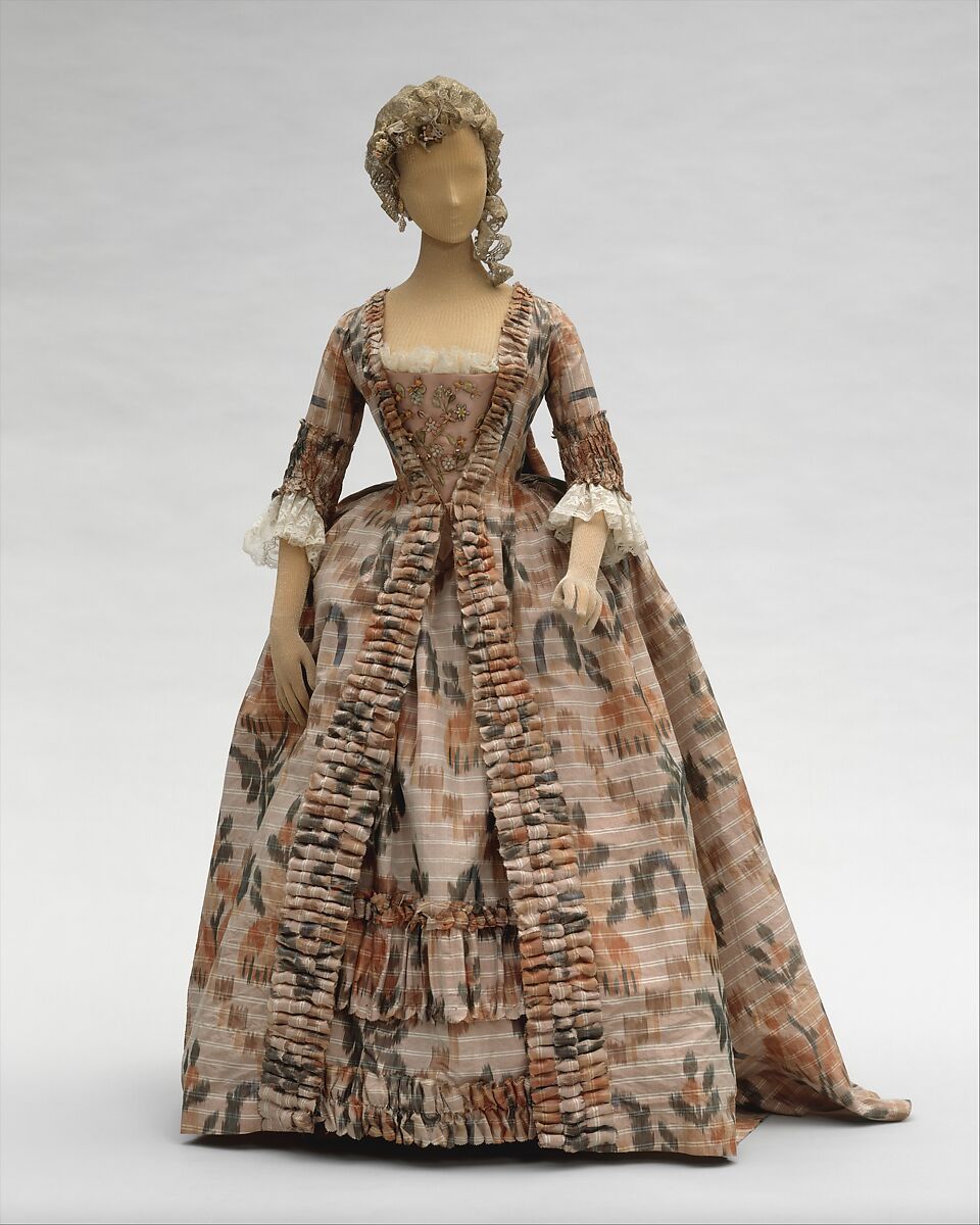 Standard European silhouettes of the eighteenth century accommodated a world of change and specifically a changing world dominated by new textile techniques from Asia and the Middle East. This French textile emulates ikat (a technique in which yarns are tie-dyed before weaving) in a manner then known as a result of a geographic mistake as chiné. The softened edges of the ikat do not mitigate a bold textile design, nor do they entirely surrender to the authority of the Western shaping. Pinked-edge pleated and ruched self-fabric (see detail) trace the form of the open robe. An eighteenth-century template of dress is all but unchanging, yet the influence of new material requires a syncretism. In terms of eighteenth-century revivals, it is important to recognize how much the classic forms of eighteenth-century dress accommodated translations into arresting new textile forms in the 1760s and even the new textiles in the cottons of the 1780s.