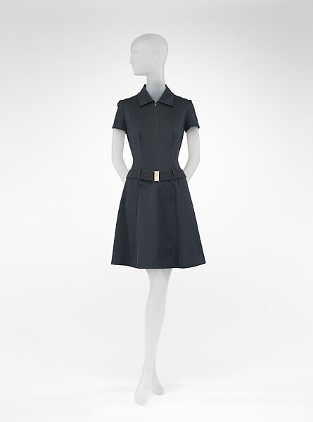 Miuccia Prada's signature utility chic style defined the minimalist aesthetic of the mid-1990s, as can be seen in this belted nylon dress, caught in the middle between a schoolgirl and military uniform. In a nod to the French futurist fashion of the 1960s as expressed by André Courrèges, this dress represents a freedom of spirit and movement for the woman who wears it, by a designer who puts women's position in society at the forefront of her design philosophy.