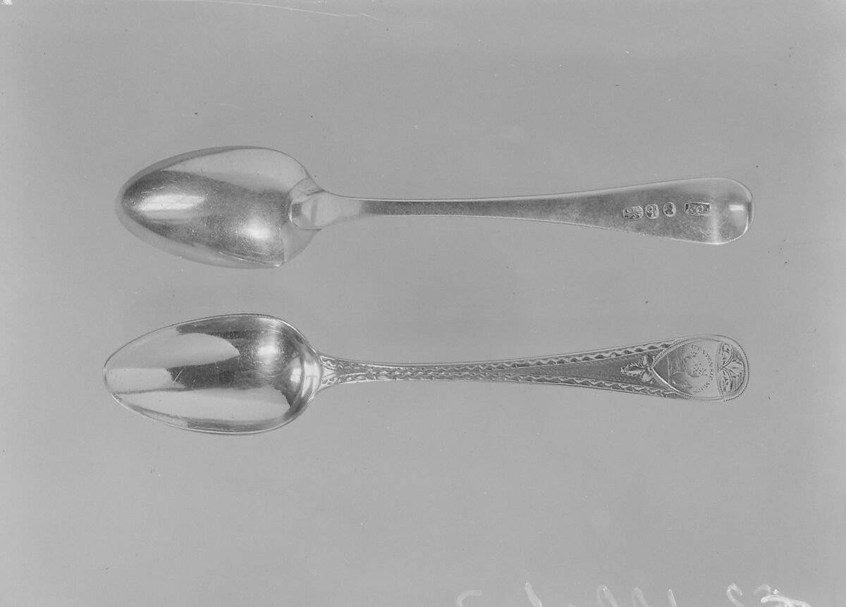 This spoon forms a pair with 52.100.2. These spoons belonged to Gulian Verplanck, son of Gulian and Mary Crommelin Verplanck. They bear the crest and motto of the Verplanck family, which translates to As in life so in death.