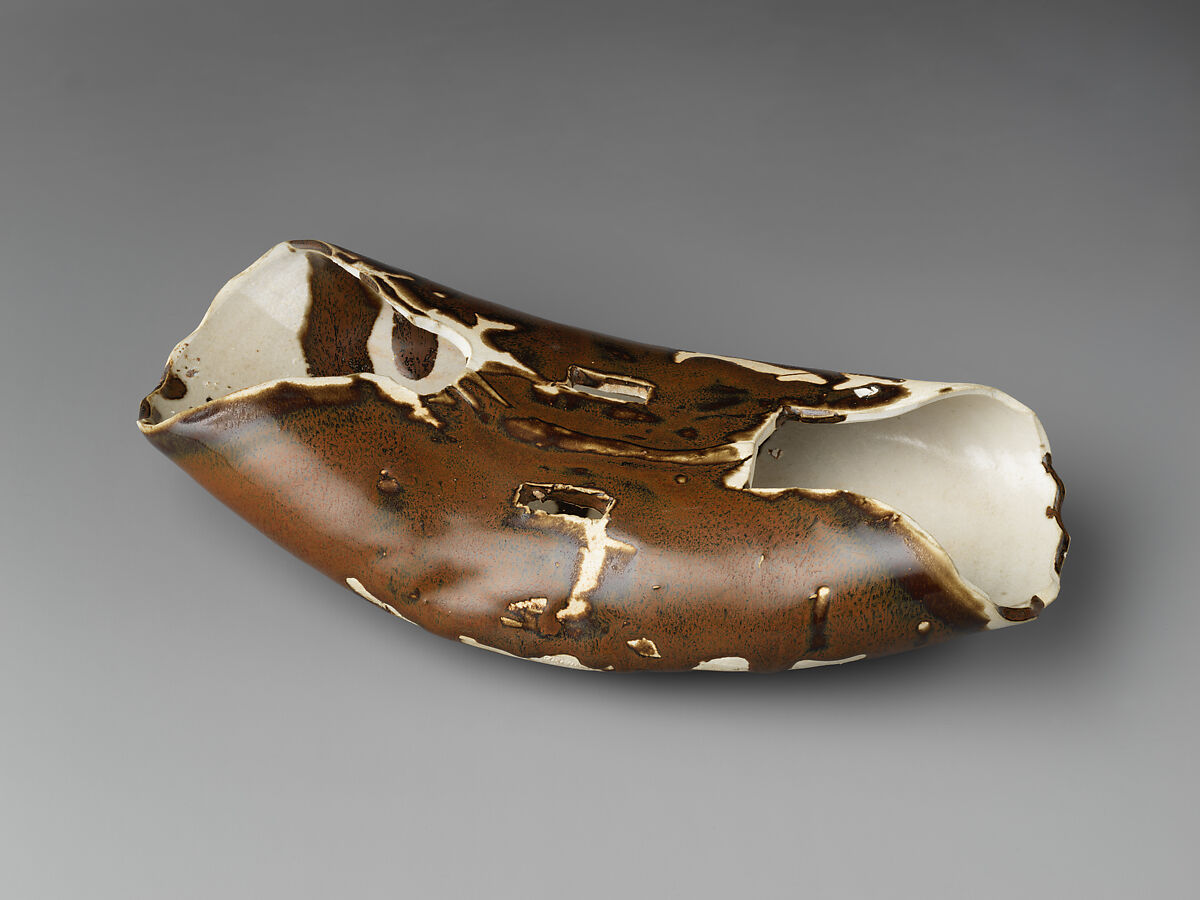 This exceedingly rare, if not unique, piece not only represents a cross-medium artistic exchange, but also a cultural exchange between Chinese and northern nomadic peoples during the eleventh and twelfth centuries. The unusual shape and brownish color suggest that it was intended to mimic a leather wrapper or parcel that would have been a common accoutrement of nomadic culture. The two rectangular holes cut into the top surface may have originally held a ribbon handle. The white porcelain body and brown iron glaze identify it as coming from Ding County (Hebei), which was the most important center of white porcelain production during the eleventh century. Located close to the border between the Chinese Song state and the nomadic Khitan Liao kingdom, this kiln site served both Chinese and nomadic patrons. After 1127, when the semi-nomadic Jurchen peoples conquered the northern portion of Song China, this county entered the territory of the Jin dynasty. It is very likely that this vessel’s distinctive leather-like form was commissioned by a Khitan or Jurchen patron.