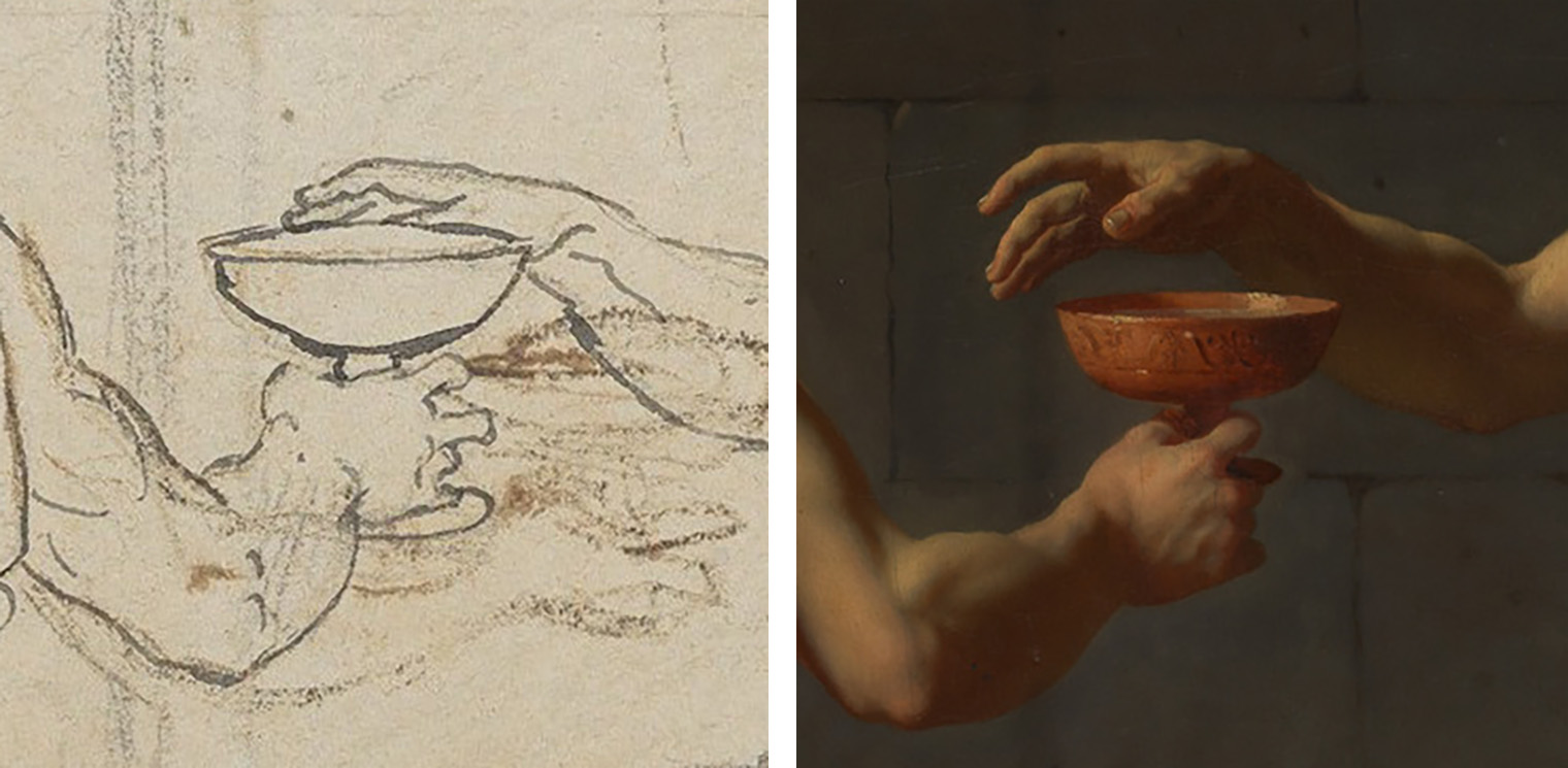 He also adjusted the position of the cupbearer, so that he no longer blocks Socrates’ leg, and raised Socrates’ arm so that it hovers over the goblet, calling attention to this critical detail.