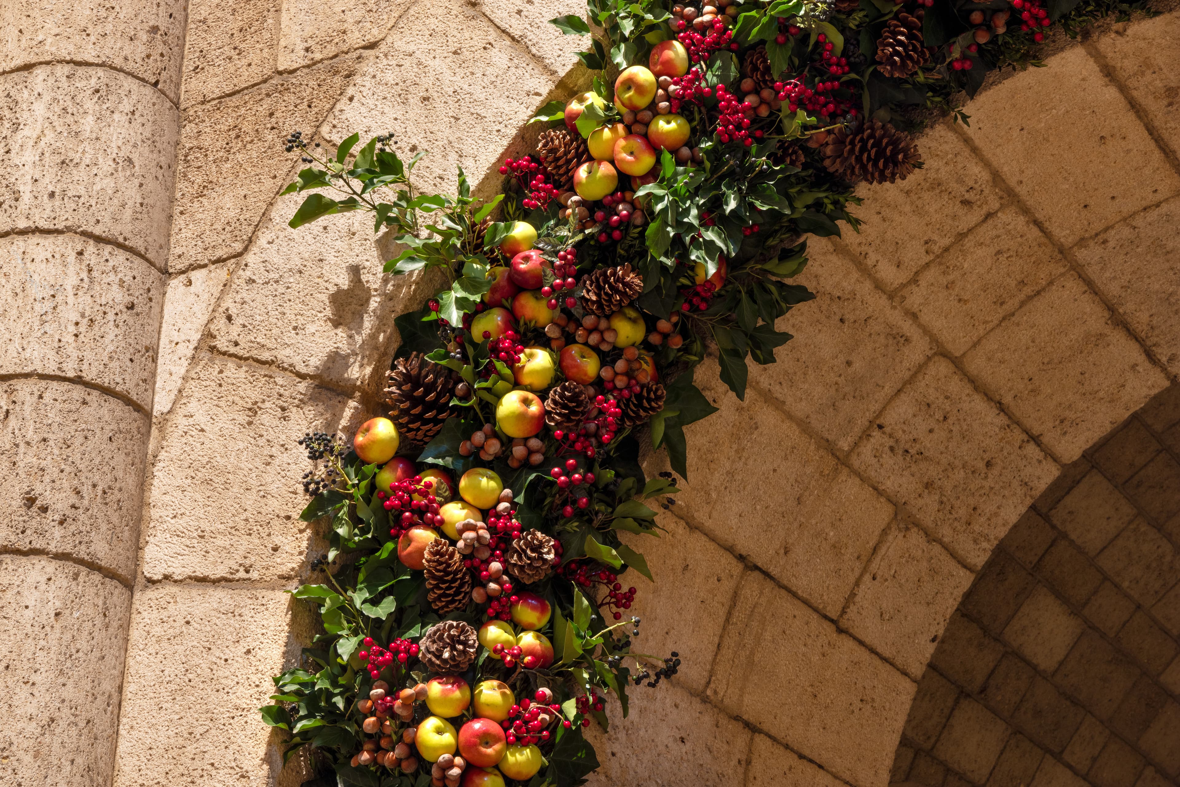 Two girls, wearing paper flower garlands in their hair engage in arts and crafts within a stone walled gallery.
