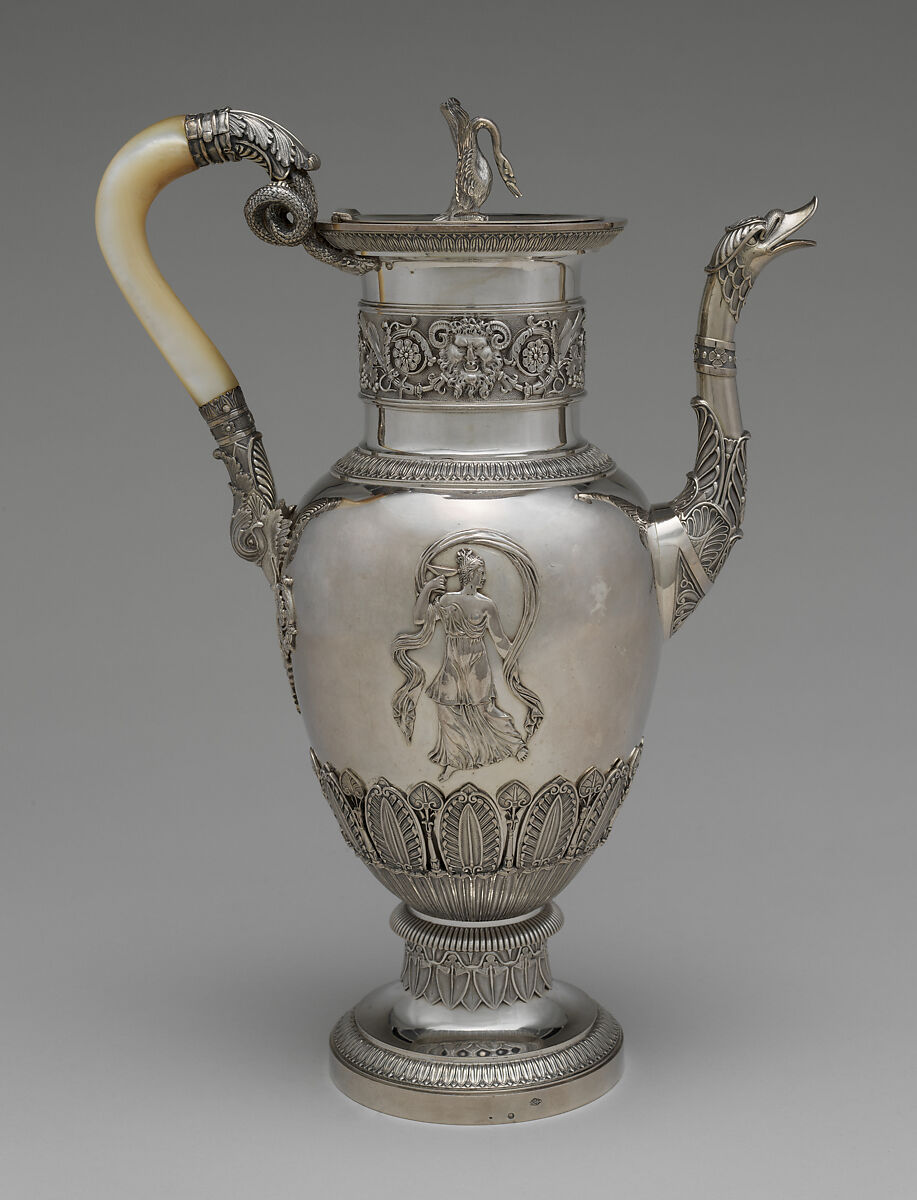 This tea and coffee service (38.12.1–.5) is distinguished both by the enormous scale of its pieces and the high quality of the cast and applied decoration. While its sugar bowl is missing, the service is an unusually grand survivor of silver from the Napoleonic period. The mother-of-pearl handles add to the impression of luxury but also serve a functional purpose, as they do not conduct the heat generated by the hot liquids that the vessels contained.
