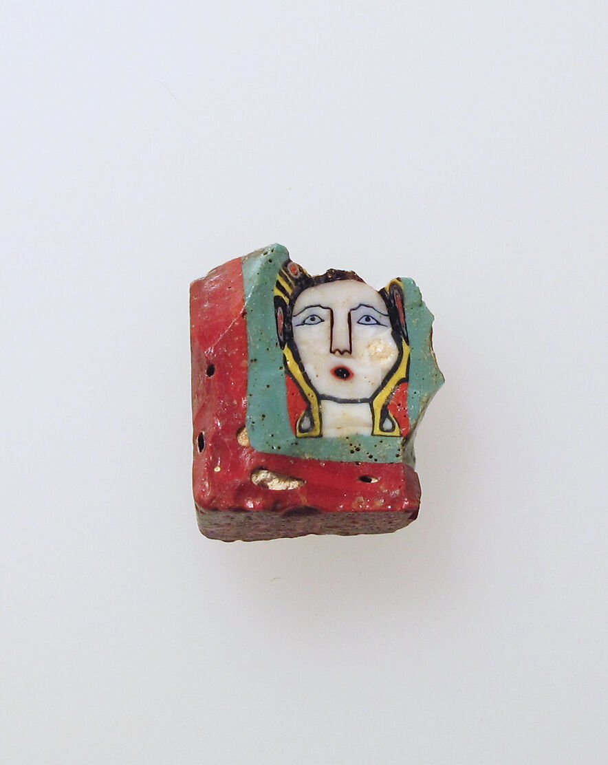 Opaque streaky red frame and opaque blue green ground; decoration in opaque white, yellow, and red, partly translucent purple appearing black and grey blue, and translucent blue.