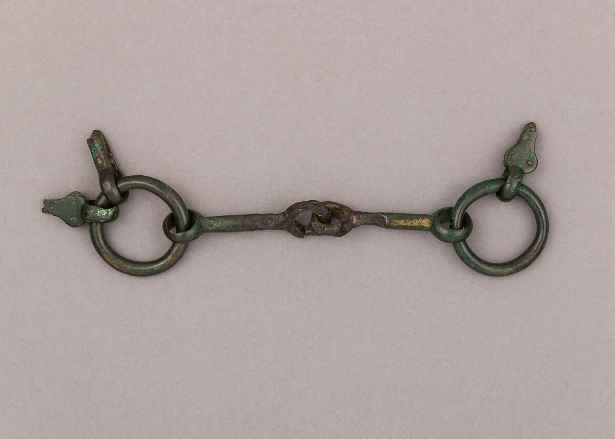The snaffle bit is the simplest type of horse bit, and has an effect on the bars (part of the horses’ jaw without teeth) and the corners of the lips. The mouthpiece consists of two square-section canons, half in bronze, half in iron, articulated in the center. The side rings retain the pear-shaped tabs with rivets used for hanging the bit from the bridle and one remaining simple straight tab on one side for attaching one of the reins.