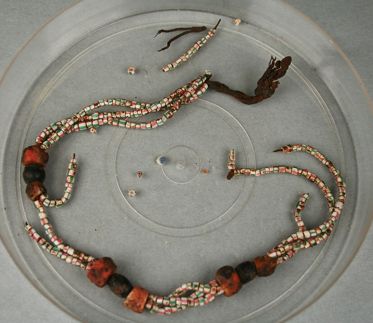 - Medium: Glass, uncertain possibly glass material, carnelian?, string