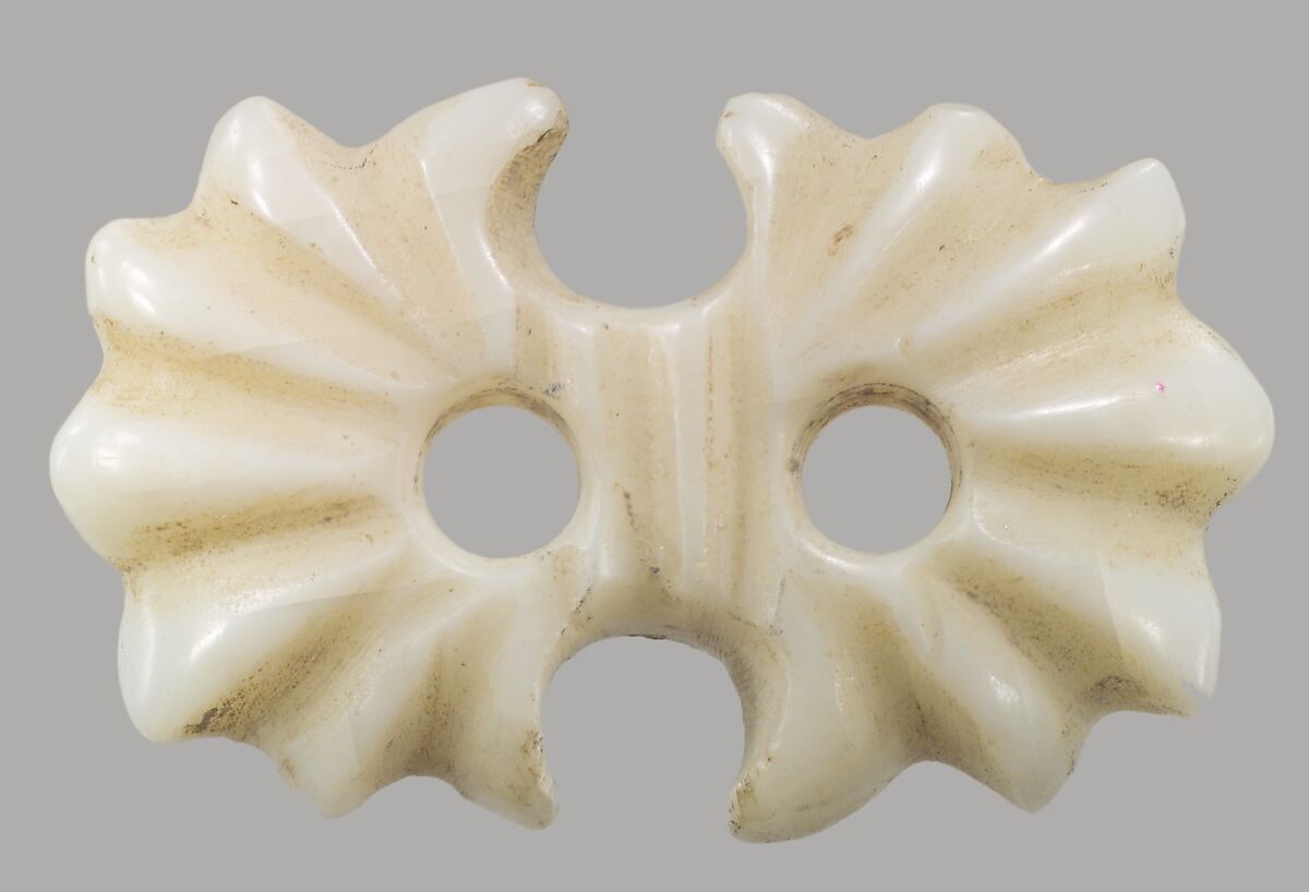 This small shell piece was found in a well in the Northwest Palace of Ashurnasirpal II at Nimrud, together with other similar shell ornaments, several of which are also in the Metropolitan Museum’s collection (54.117.16, .17, .19). They were probably thrown into the well when the palace was sacked, in 614 B.C. and then again two years later. They can be identified as horse trappings, and were probably part of a leather harness which disintegrated in the well sludge. Horses in the reliefs of the palace of Sargon II at Dur Sharrukin (modern Khorsabad) are represented with double-fan shaped ornaments on their bridles, as in a relief in the Metropolitan Museum (33.16.1) showing a groom with two horses. Because of the close parallel with the reliefs from the palace at Dur Sharrukin, the equestrian harness elements from this well probably date to the time of Sargon in the late eighth century B.C. At this time, the Northwest Palace was primarily used for storage rather than as a royal residence.