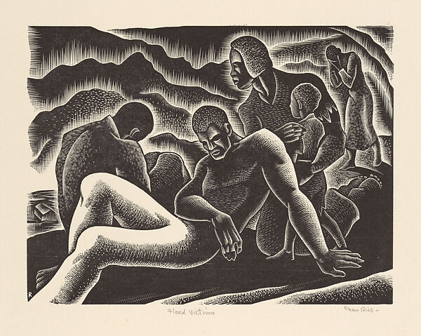 In this wood engraving from about 1938, Rico focused on a group of flood survivors rather than on the violence of the natural disaster. The image shows a family fleeing the inundated landscape in the background, with hints of the event's aftermath visible on the lower left side of the composition. The dire consequences of the flood reflect in the sorrowful facial expressions of the male and female figures at the center. Rico’s representation of Black people as victims exemplifies the disproportionate damage of flooding to African American communities in the past and present. This image was made ten years after the Great Mississippi Flood of 1927, which affected many of the lowlands of the Mississippi Delta, where most landowners were Black.