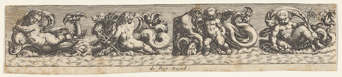 Frieze with four sea monsters ridden by putti. At left, a dolphin-like creature, followed by a three-headed dog ridden by a putto holding a trident, and an elephant. From a series of five plates after Giovanni Andrea Maglioli (SKB 4350).