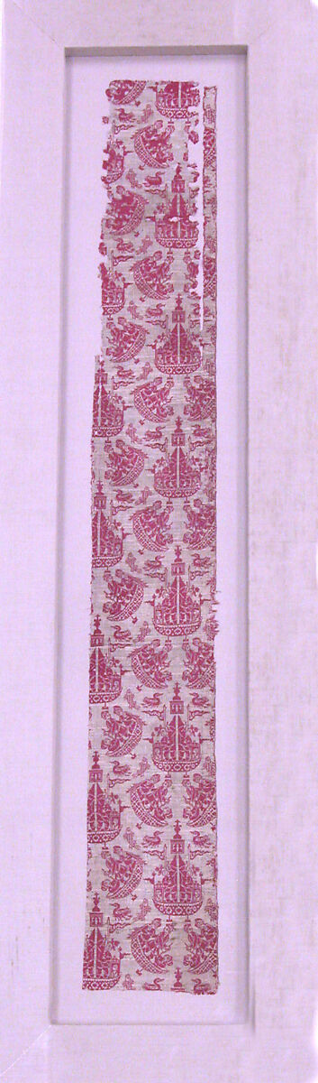 This fully reversible fragment of a complex double‑weave textile shows sailing ships, swimming ducks, and leaping fish on a minuscule scale in white or red, respectively. The sailors appear to be European, reflecting a typical Safavid motif, which developed as a result of the extensive maritime trade between Europe and Asia.
