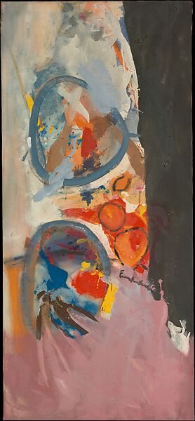 After seeing a show of Jackson Pollock’s recent work in New York in 1950, Frankenthaler worked to extend Pollock’s drip-and-pour method to include large collagelike forms of color. The year after she made this picture, Frankenthaler commented "I am involved in making pictures 'hold' an explosive gesture, something that is moving in and out of landscapelike depths but lies flat in local areas—intact but not confined . . . "