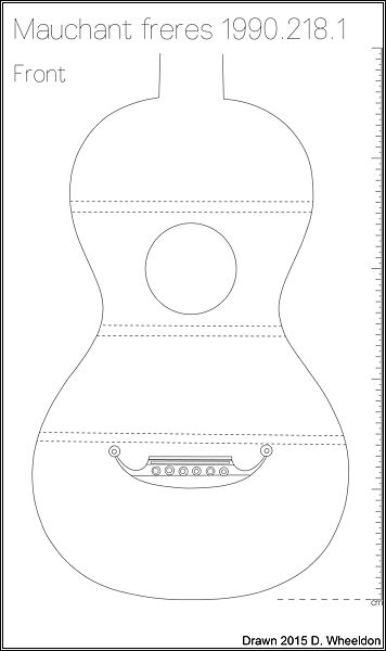 Technical description: Six-string guitar; pine soundboard with binding of laminated unequally sized strips of ebony and ivory (from edge in) pattern of b/w/b/w/b/b/b/w/b that continues around body and fingerboard; soundhole diameter of 80.47 mm with binding (inside out) of b/w/b/w/b/b/b/b/b/w/b/w/b/b; ebony pin bridge with mother-of-pearl inlaid dots; burl (burr) maple veneer on pine wood back with ivory binding with a black inked line; ribs of burl (burr) maple; ebonized hardwood back (glossy black veneer); headstock replaced; ebony fingerboard with matching binding as body and seventeen nickel-silver frets (twelve on body, five on soundboard); slotted brass worm gear tuning mechanism with bone buttons and rollers (old, but not original) (Daniel Wheeldon 2016)