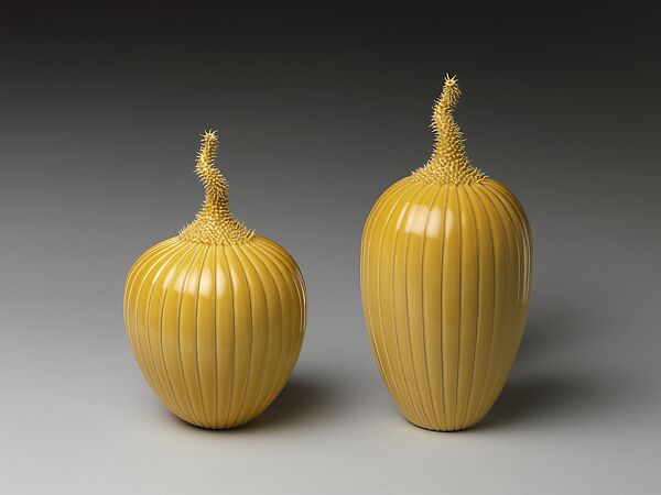 Lee spent years studying the imperial yellow glazes of traditional Chinese porcelain. Originally a neurosurgeon, he created the stems of these melons through the painstaking application of small bits of clay.