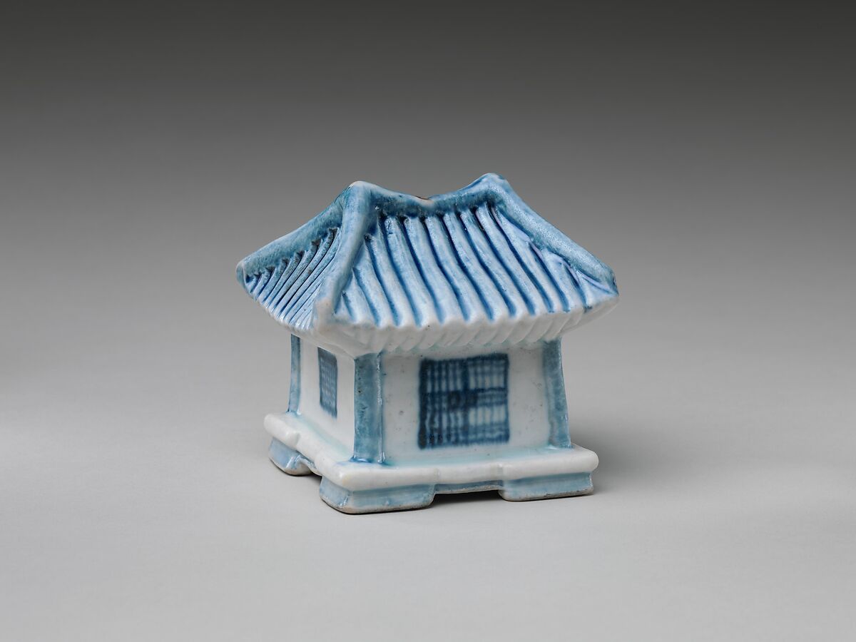 On this porcelain water dropper in the shape of a traditional Korean house, the tiled roof, lattice doors, and windows are all accentuated in cobalt blue.