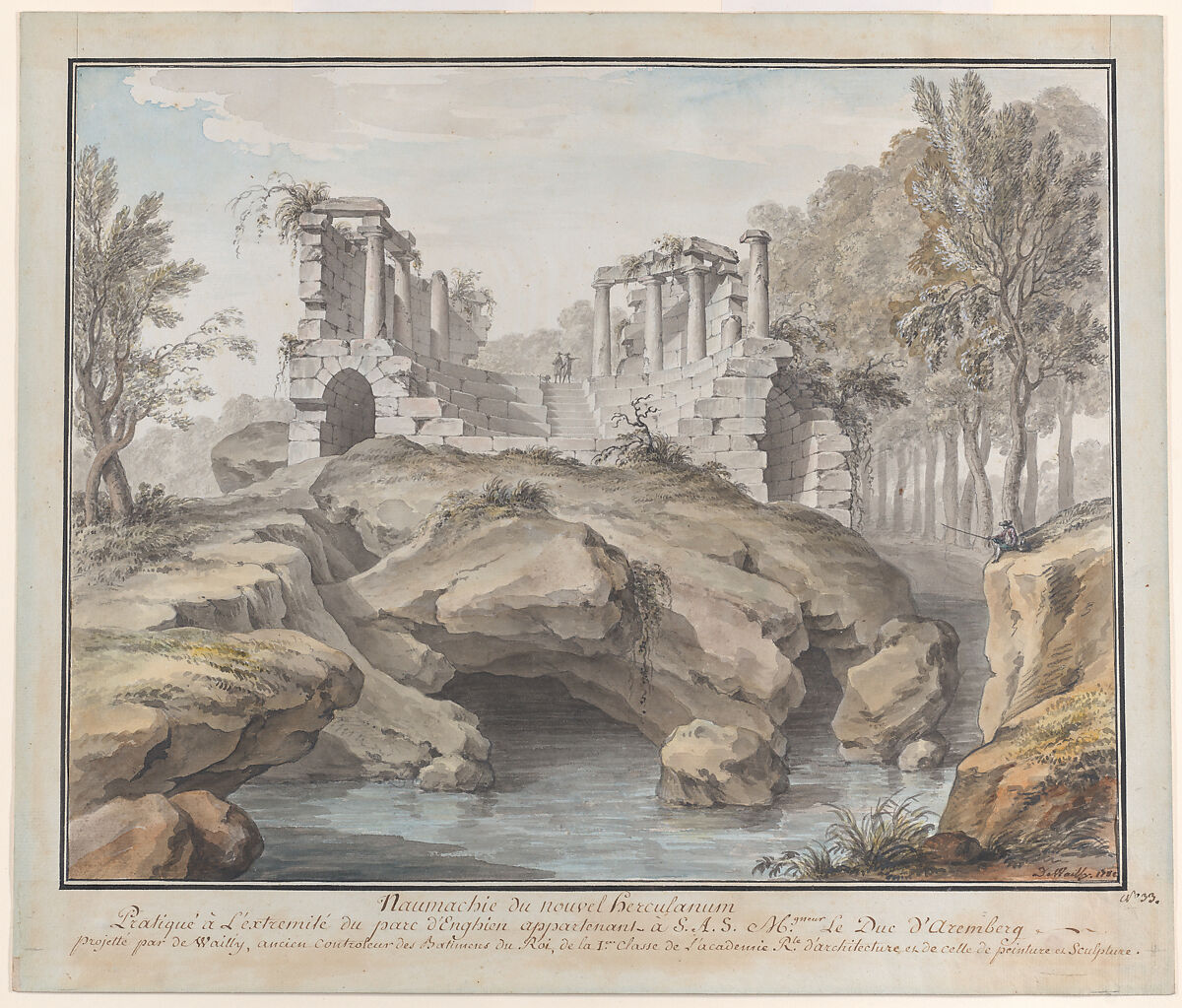 This is one of three drawings from the collection of Mrs. Wrightsman, made by the artist Charles de Wailly for the gardens of Enghien. They were part of a larger plan developed by the Duke of Arenberg to redesign the palace and gardens. In 1780 he attracted De Wailly to this end, who finished his overall redesign in 1782, which was never realized. His plans for the garden included this site for a Naumachia, which along with a triumphal arch and the Temple of Apollo was one of the follies meant for the area of the garden described as Mount Parnassus or "New Herculaneum". The drawing in pen and ink with watercolor shows the site of the Naumachia as the ruin of an amphitheater, surrounded by a body of water.