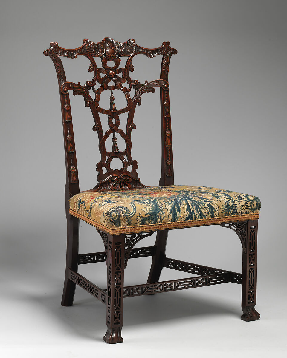 The unknown maker of this chair has playfully combined different design ideas by Thomas Chippendale. The back is derived from Chippendale’s so-called "ribband back chairs" while the fretwork legsare based on his plates for "Chinese chairs." These designs were published in Chippendale’s The Gentleman and Cabinet-maker’s Director which appeared in three editions between 1754 and 1762.