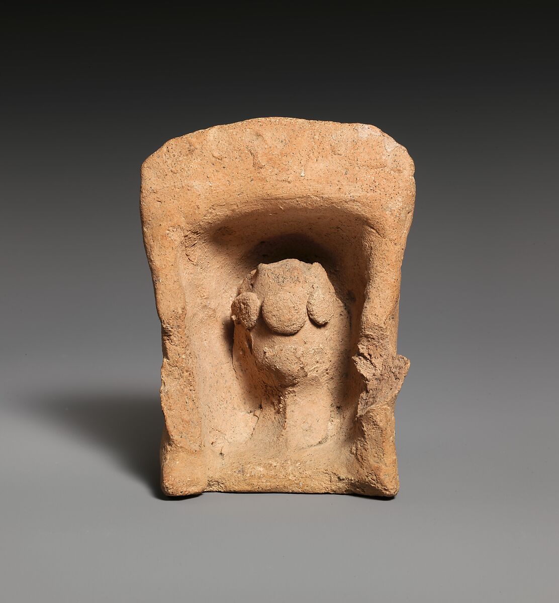The model originally had pilasters on either side of the opening. The vertical form inside is an aniconic representation of the fertility goddess Astarte. Similar depictions are known from the Levant and Cyprus. Model shrines began to be made in Cyprus during the Chalcolithic period and, due to Phoenician influence, were produced in particular quantity during the Archaic period. All of the excavated examples come from tombs.