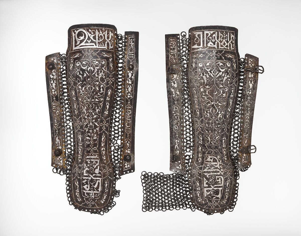 This right leg guard, along with a left leg guard also in the Metropolitan Museum's collection (acc. no. 1990.229), forms the only known matching pair of mail-and-plate guards of the fifteenth century for the lower legs. Similar floral ornament and Arabic inscriptions also are found on turban helmets.
