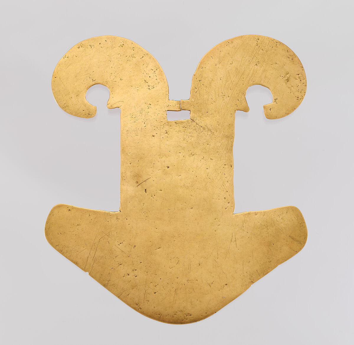 The overall "heart" shape that has given this pendant type its name is sometimes not immediately recognizable, particularly in examples from the Tolima area on the middle Magdalena River. These pendants more closely resemble a ceremonial knife with a handle with two split curved elements at the top. The majority were cast of tumbaga, an alloy containing a higher percentage of copper than gold, and then gilded by removing the surface copper in an acid bath.