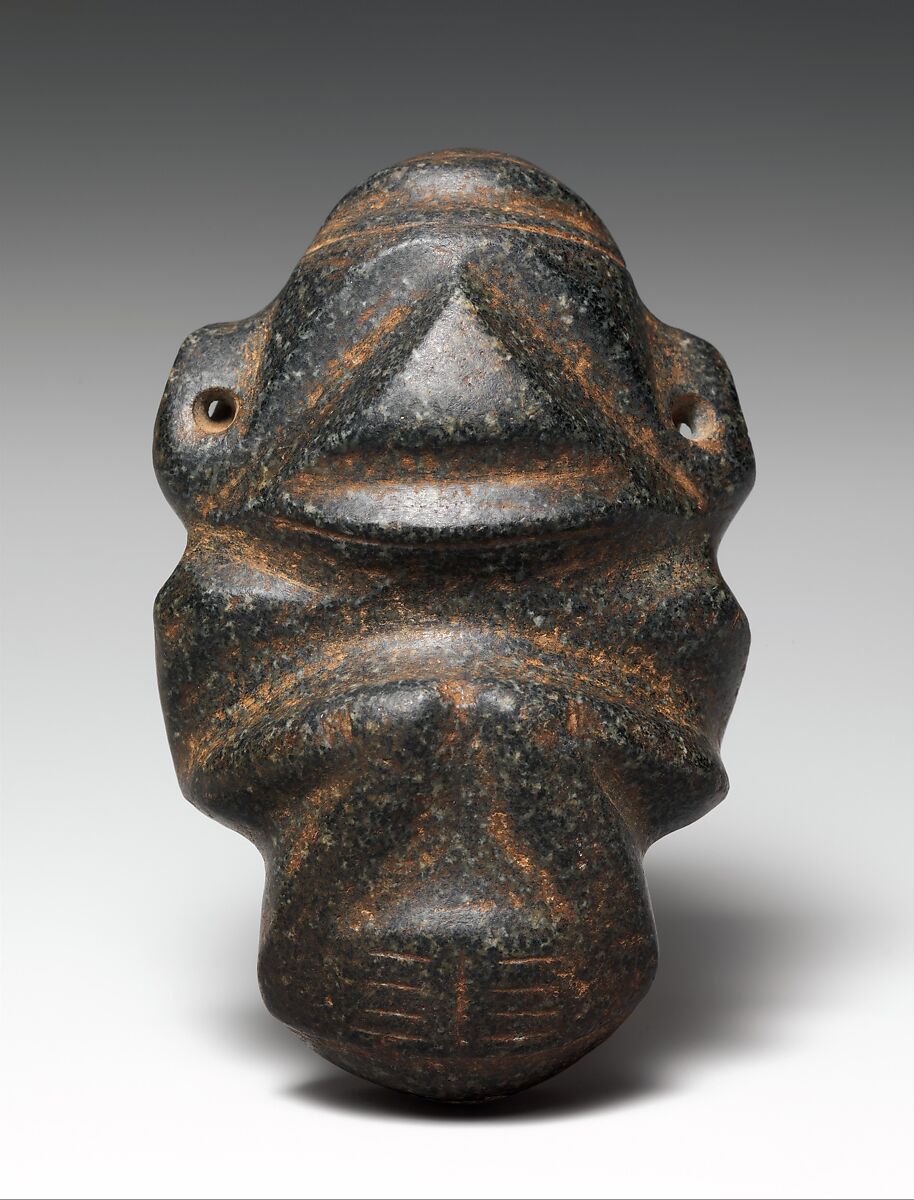 This stone pendant, worn by Taíno leaders and healers, features a crouching anthropomorphic figure known as a zemí. Zemí (or cemí) is a term used by Taíno peoples, the diverse societies that inhabited the Antilles archipelago before European contact, that linguistically relates to a quality akin to sweetness. Zemí refers not to an object or image but to an immaterial, spiritual, and vital force pertaining to deities and ancestors. There are several known zemí identities recorded by the Spanish, some of which have been linked to archaeological images.
