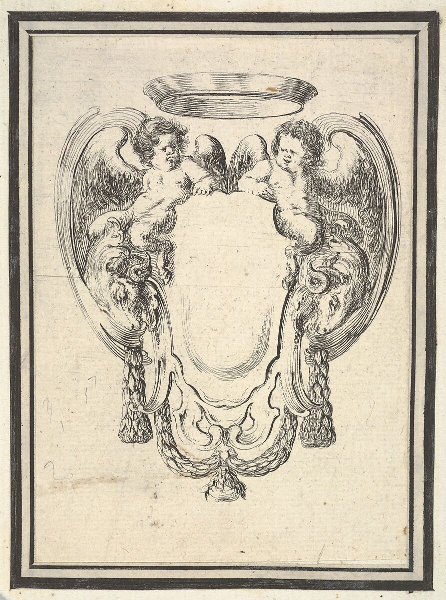 • Title: A cartouche flanked by two winged infant satyrs riding on the heads of two rams, plate 12 from "Nouvelles inventions de Cartouches"