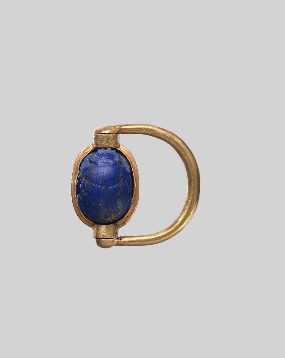 This ring is inscribed on the underside of the scarab with the names of the joint rulers Hatshepsut and Thutmose III. Its bezel is mounted on a swivel, allowing the scarab to be flipped and be used as a seal. Its underside could be impressed onto mud sealings that sealed documents or the content of bags and chests.