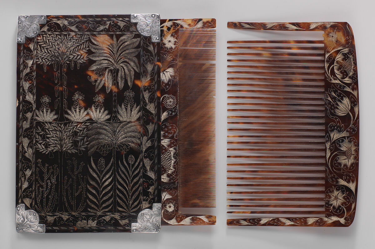 This comb case with two combs is richly but simply decorated. It was made in 1685 in Port Royal, Jamaica, which was then Britain’s wealthiest colony. It is a rather poignant expression of a painful cultural moment. Bought with wealth generated by enslaved Africans, it embodies the English appreciation of Jamaica’s glorious natural history and the simultaneous savaging of it. At once precious and humble, it reflects the resourcefulness of local merchants who devised a product that was portable, inscribable, and at least somewhat useful (a wig comb in two sizes, one for the wig the other for lice).