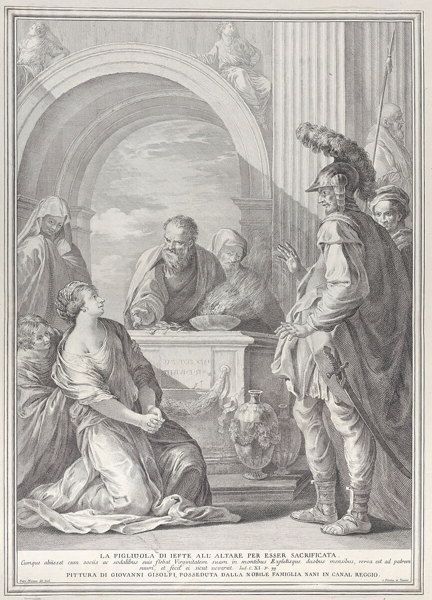 - Title: Jephthah's daughter kneeling by the sacrificial altar, with her father standing at right