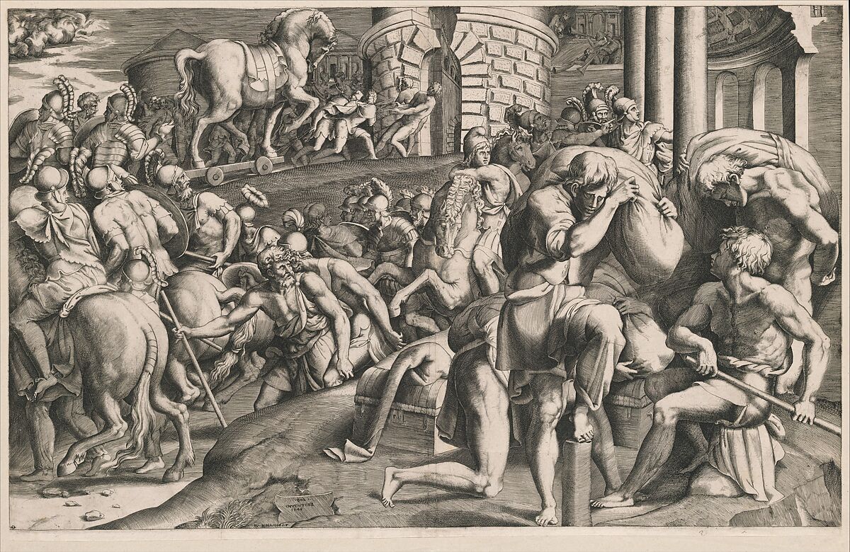 Since the Trojans had been persuaded that bringing the horse into their city would lead to the Greeks' defeat, the walls were breached and the horse was wheeled in, with the most valiant Greek soldiers hidden inside. This engraving is based on a drawing by Primaticcio, now in the Royal Library at Windsor Castle, that probably represents an early idea for the fresco of the defeat of Troy in the Galerie d'Ulisse at Fontainebleau (1541–47).