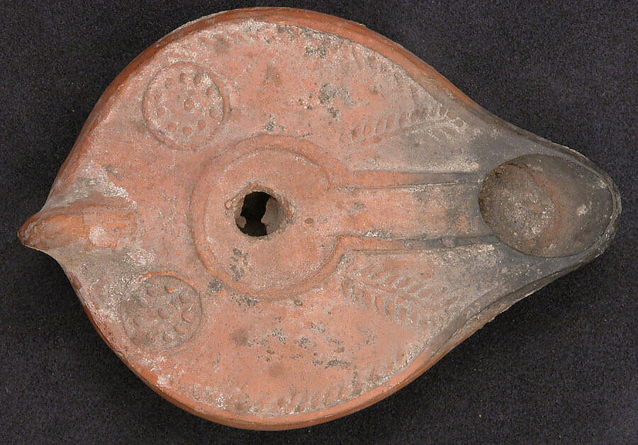 Small earthenware lamps, made from double molds, were the most commonly used source of light in daily Coptic life. A wick produced from plant fiber or linen fabric was placed in a reservoir filled with oil, generally castor or sesame oil, and illuminated. The flat top of this red earthenware lamp is decorated with circles enclosing pellets near the handle and palm branches near the spout.